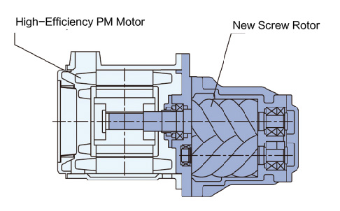 電機和螺桿主機采用同軸直聯一體結構,消減了傳動能耗,實現高效化。