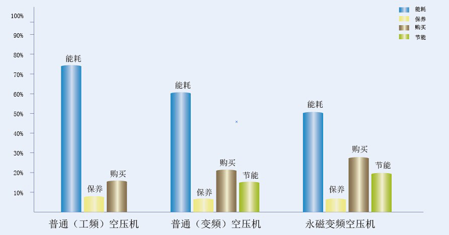 購買空壓機時,傳統意義上的成本(即購買成本+保養成本),其比例只占到總成本的25%,而能源消耗卻占到了75%。